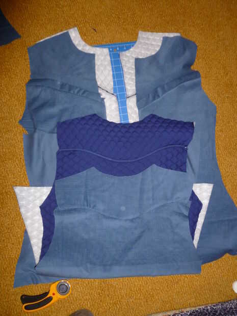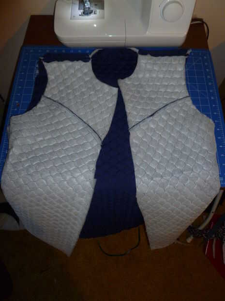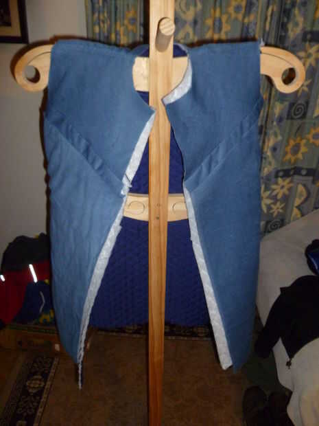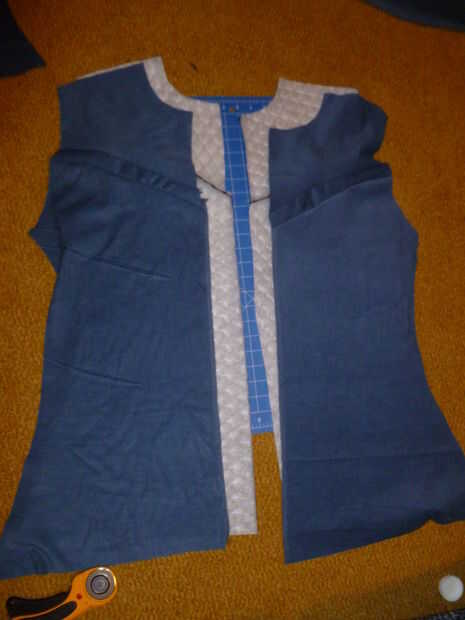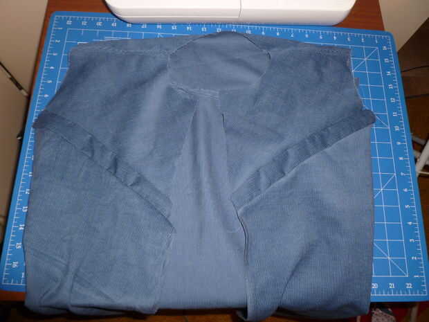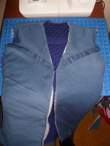 Conecte las guarniciones, derecho lados juntos, en los hombros y los lados, y luego hacer lo mismo con las piezas pana. Deje la parte inferior 4" de todas las costuras laterales plegadas ya que habrá un partido allí. Ponerlos juntos y tratar. Asegúrese de que todo encaja y no son necesarios alteraciones. Asegúrese de que en el frente, cabe recordar que necesita acerca de 3/4" superposición de los dos lados, un margen de costura, y usted va probablemente usando una camisa hinchada por debajo.