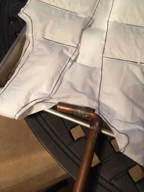 Ahora que la vejiga se llena, cerrar la costura que quedó deshecho deben soldarse. He dejado sobre una media pulgada de costura abierto sobre los hombros donde no hay ningún gel con el fin de que cualquier escape de aire. Ya que el cuello se curva soldado esta área por el lado más pequeño de la tubería de cobre de alrededor y por debajo de ella y luego sostiene en su lugar fue capaz de poner el soldador que la pesca. No se olvide el papel de horno en ambos lados del plástico. También tenga cuidado con que la punta del cautín como instantáneamente hará agujeros que deben ser parcheados si accidentalmente golpea el plástico directamente (a mi me pasó dos veces).