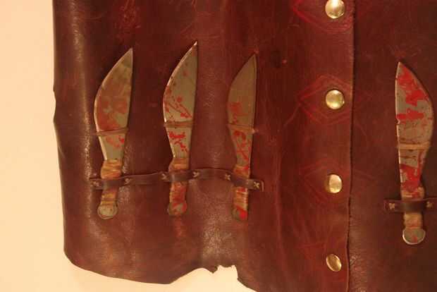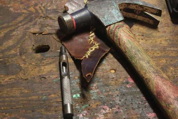 Sorteo donde quieras los broches de presión a ambos lados de la caja delantera. Utilice un martillo y perforar agujeros en el cuero. Asegúrese de que usted perfora en madera o plástico, para no dañar el extremo del punzón. Utilizar las herramientas que vienen con broches para establecerlas. Tenga cuidado al colocar broches de presión debido a los frentes y respaldos pueden ser un poco confusos. Asegúrese de que usted ponga em hacia fuera exactamente cómo desea que ellos, así que hacerlo bien y no terminan de perforación hacia fuera el complemento. Después de ajustan los broches añadí unas tiras de cuero para cuchillos y tendones para tapas de cuchillos. Los cuchillos son removibles.