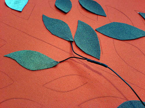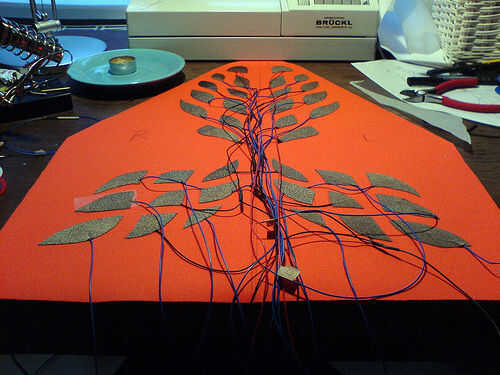 La tecnología dentro de la chaqueta es realmente muy simple. Estamos haciendo botones de materiales blandos y extendiendo sus salidas con cables a un punto central, el enchufe. Las capas de neopreno no son funcionales, simplemente dan una buena sensación a la chaqueta y lo suficientemente fuerte para soportar el masaje frecuente. underneeth el neopreno existen parches de tela conductora pegados a ambos lados y entre allí es una capa de espuma. La espuma ha sido perfora con agujeros donde están los botones, para que al pulsar sobre un botón, efectivamente están llevando dos capas de tela conductora juntos y así cerrar el interruptor y el botón.