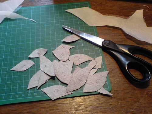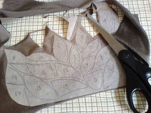 Utilizando la misma plantilla de botón, trance las formas de botón en la hoja de hierro y numerarlos. La hoja de hierro en el tejido conductor de hierro. Ahora puede cortar los botones 38 desde el tejido conductivo y mantenerlos en un lugar seguro.
