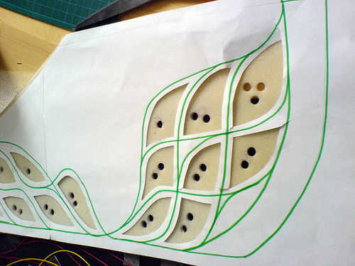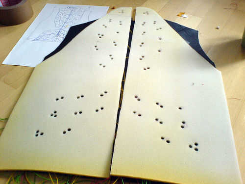 Además, trance la forma interior en espuma y recórtalo. Luego traza la plantilla del botón en la espuma para marcar donde hacer los agujeros. Uso de un agujero, distribuir uniformemente sobre los agujeros 3, 4 o 5 por tecla, dependiendo de su tamaño.