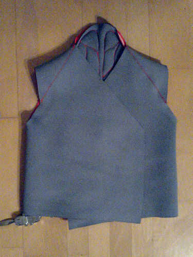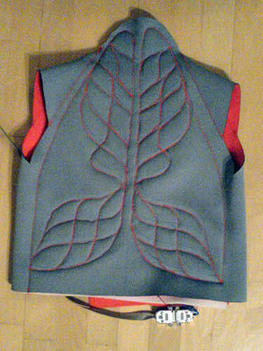 a) neopreno exterior con todos los 38 botones planchada en y los cables prolijamente arreglan (usando unos puntos de sutura si es necesario) para que estos recogen a lo largo de la espina dorsal y terminan en un punto en el dobladillo inferior.