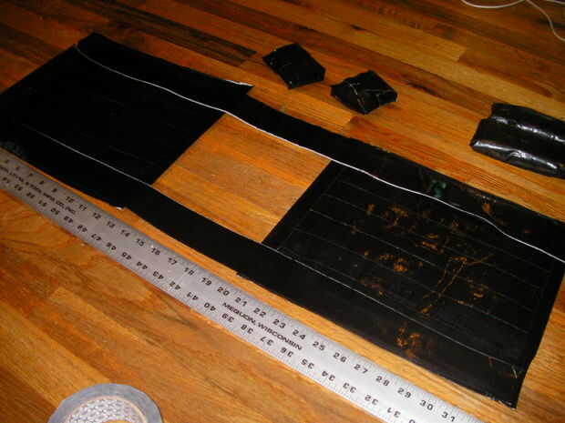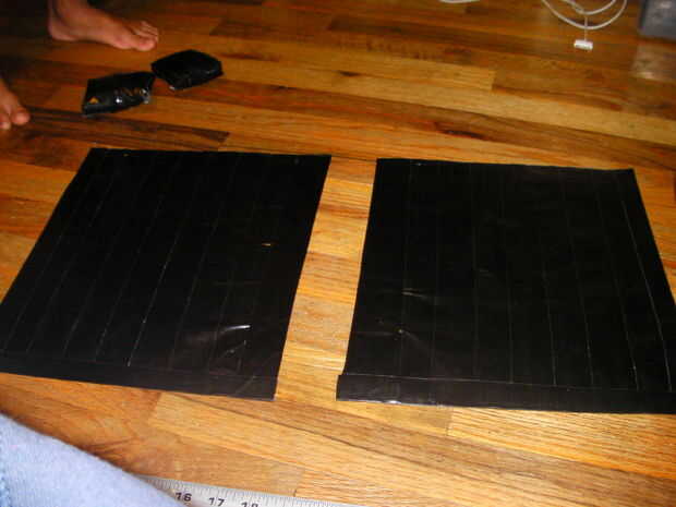 Cortar la tela de la cinta de conducto por la mitad, ahora tienes dos piezas (delantera y la parte posterior del chaleco). A continuación empezar a hacer las cintas de corte y midiendo un pedazo de cinta adhesiva de 33". Cortar otra pieza del mismo tamaño y colóquela sobre el primero, ahora tienes una correa (repetir para la segunda correa). Coloque las tiras en la parte delantera y trasera del chaleco, asegúrese de que la cabeza de la persona puede caber fácilmente a través de la abertura del chaleco.