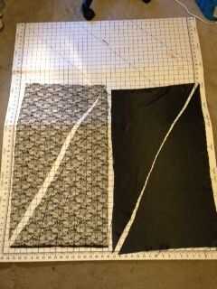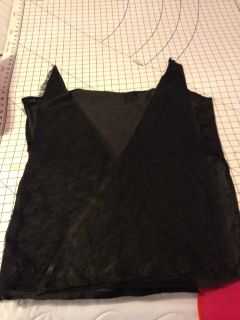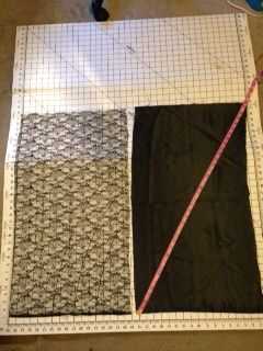Entonces tomé el cordón y el satén tejidos y cortarlas a lo largo y ancho de las dimensiones de la camiseta.  Esto se utilizará como la parte delantera del chaleco.  Luego corté a la tela en dos triángulos.  Os adjunto el cordón cortado al raso con pernos de corte.  Satén es un tejido muy resbaladizo por lo que es importante que no pase esto!