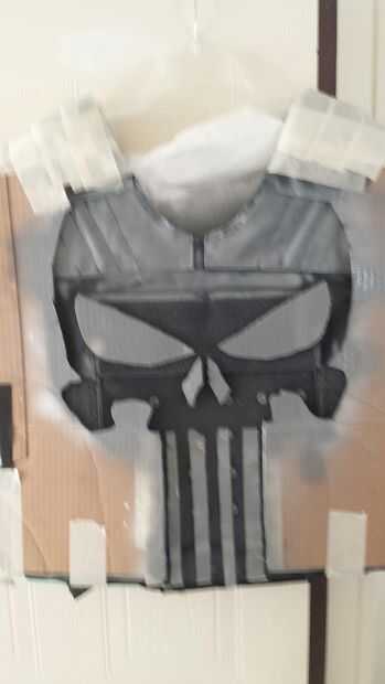 Tomé el patrón de la camisa y transferido sobre un cartón. Una vez que recortarlo yo poner el contorno en el chaleco (cinta hasta lo que no quiero pintado) y mi primera capa de pintura gris. Decidí ir con gris para la mirada de Punisher Warzone.