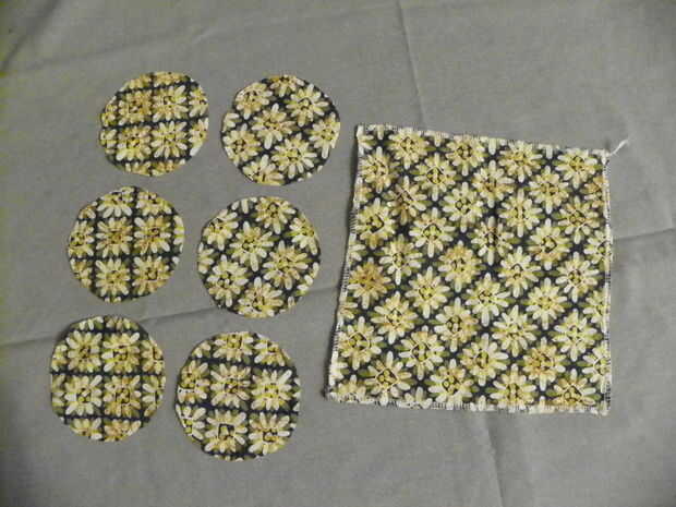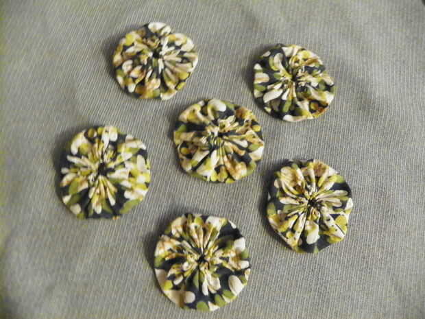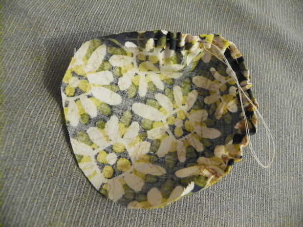 Cut 6 -4 "círculos y una plaza de 8" de algunos pedazos de tela del desecho. La Plaza es para que un pañuelo en el bolsillo. Si no utiliza el bolsita no necesita la Plaza. Serged alrededor de los bordes de la Plaza, pero usted podría simplemente gire el borde inferior 1/4" y después vuelva a girar bajo y máquina el dobladillo lo. Los círculos son para hacer el "Yo-yo". Disfruto mucho haciendo estos a añadir un poco de encanto a una prenda o bolso. Tomar uno de los círculos y gire bajo el borde 1/4", con un hilo y aguja, coser una puntada de correr todo el camino alrededor del círculo. Tire suavemente y asegurarse con unas puntadas. Repita con los otros círculos y aplanar hacia fuera. El yoyo terminado será 2" de ancho. Decida donde quiere el yo-yo del chaleco y el pin. mantenerlos por lo menos 1/2" fuera de los bordes ya será el margen de costura. Pines para el chaleco y coser a mano. Doblar el pañuelo cuadrado y colocarlo en el bolsillo Embellish el chaleco con cinta, botones decorativos y arcos, etc.... Use su imaginación.