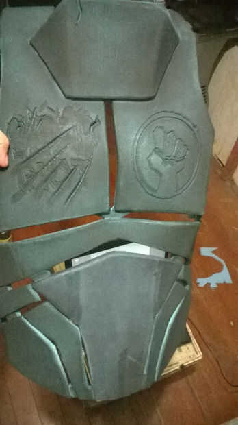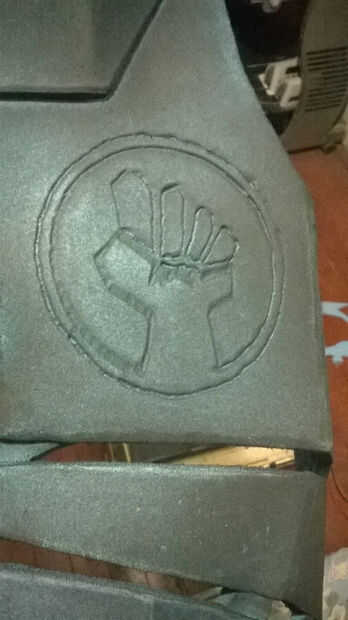 Sólo tienen 2 botes de pintura disponible, 1 plano negro y 1 capa clara por lo que no puedo grafitear el emblema. Así que decidí grabar usando el soldador. Hizo también algunas marcas de batalla profundo. Aerosol pintado una capa ligera para ver cómo se ve pintado de negro. Dejar secar durante 15 minutos o menos.