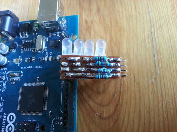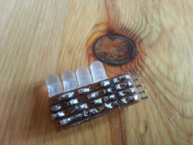 Ahora viene la parte fácil: sólo la soldadura todos los LED-pernos, luego las 4 resistencias (primero utilicé 3 throughholes k 3 y luego 0 k 5 DME) y los pernos de la 4 rúbrica. Mantenga un ojo agudo en cualquier cortocircuito en el lado frontal y posterior de la Junta.
