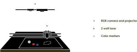 La configuración consiste en un proyector y una cámara RGB montada en la parte superior. La cámara RGB tiene dos funciones. En primer lugar, realiza un seguimiento de los movimientos de la mano mediante la exploración de la imagen. En segundo lugar, realiza un seguimiento de los marcadores de escala y posicionamiento. El proyector proyecta por otro lado la imagen escaneada en la superficie del material utilizada para el corte.