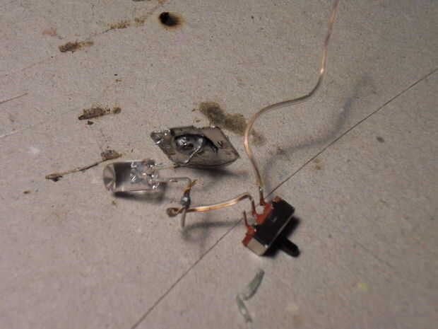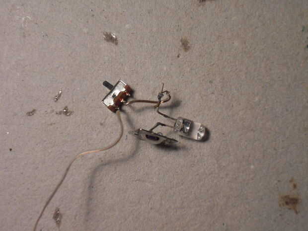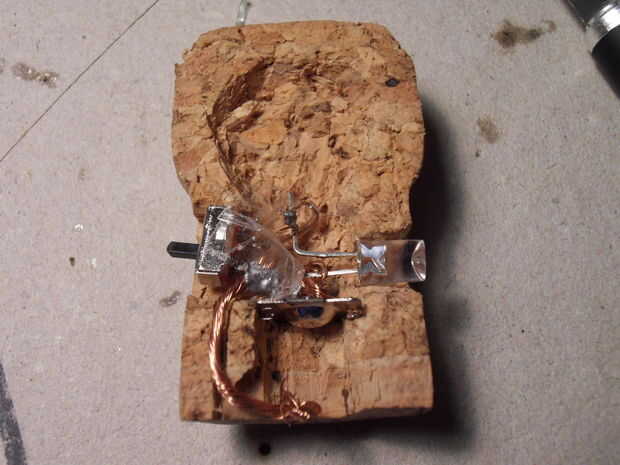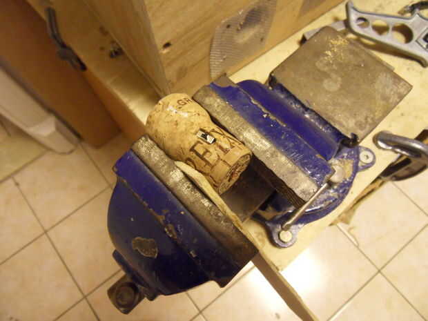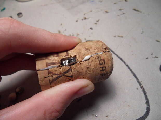Pegue los cables en el corcho para evitar que se mueva. A continuación, pegar los dos lados del corcho con pegamento de madera. Ahora el interruptor debe estar accesible en la parte posterior y el LED visible desde el frente. Deje que se seque durante la noche.