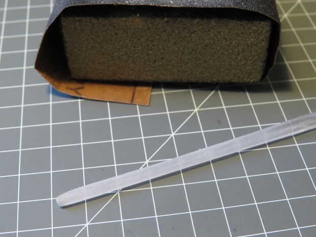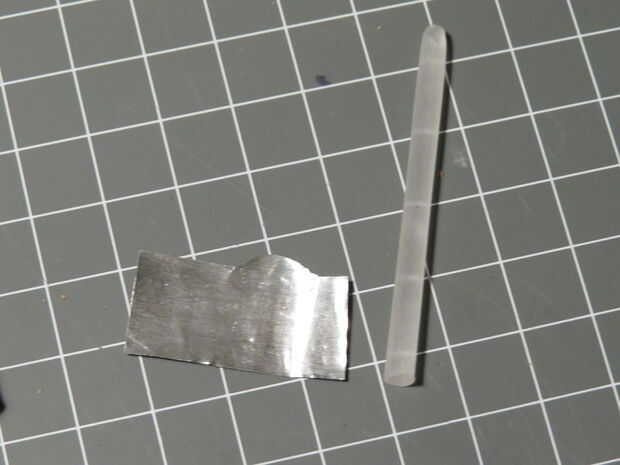 Para la empuñadura usé algunas láminas metálicas que recibí de un envase de alimento. Cortar un pedazo pequeño de la forma como se muestra arriba y pegar la parte superior de la misma alrededor de la parte inferior de la hoja, permitiendo que haya suficiente espacio dentro de la hoja para el LED.