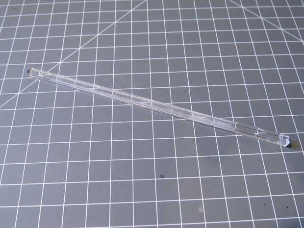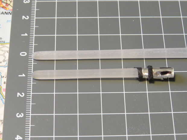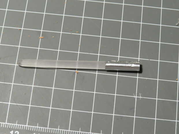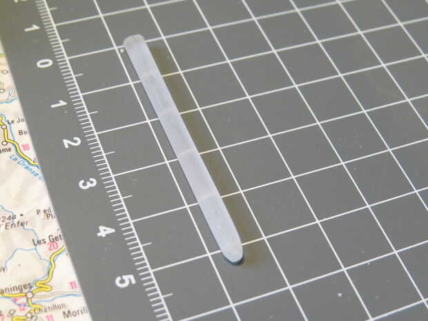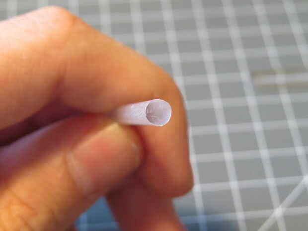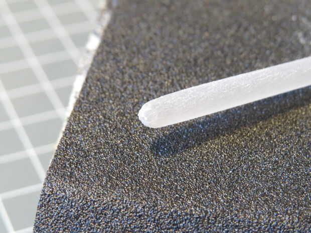 Encontrar un agitador de plástico transparente (la mayoría de bares y restaurantes deben tenerlos) y comienza a lijar hasta una barra redonda con un papel de lija. Tratar de llegar a un diámetro de unos 3-4mm. No importa si usted no puede recuperar su transparencia original, translúcidas u opacas ligeramente las barras funcionan mejor. Redondear un extremo de la varilla y usar una herramienta giratoria Dremel (o similar) para cortar unos 5cm del agitador. Utilicé un disco de lijar Dremel porque me dio una superficie lisa agradable que era casi transparente (esto es debido a que la Dremel realmente derritió el plástico, en lugar de simplemente cortarlo). El extremo cortado debe ser lo más transparente posible para que mucha luz puede pasar a través.