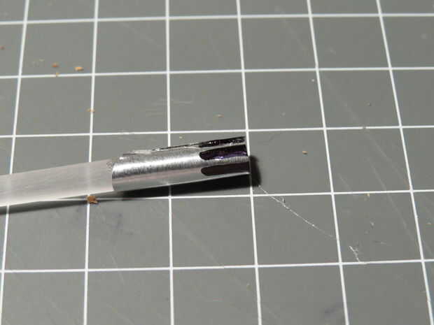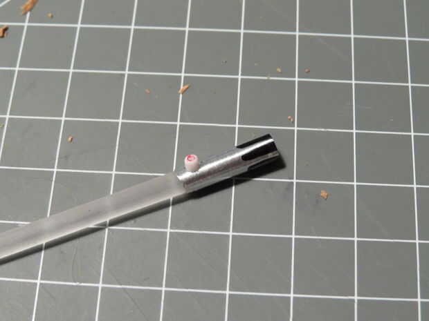 Para agregar algunos detalles, utilice un marcador permanente negro fino para añadir algunas rayas en la parte inferior de la empuñadura y pegamento en una pequeña cantidad como un botón, como se muestra arriba.