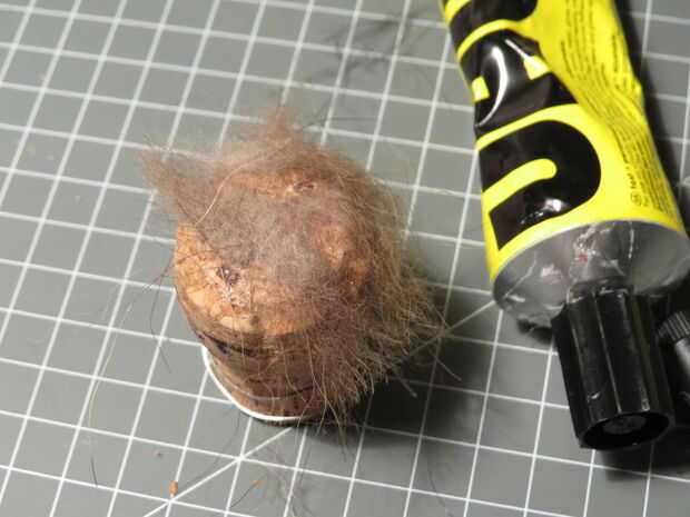 Corte fajos de piel/pelo y empezar a pegarlos a la cabeza. Siempre pegar en la parte superior solamente y en un sentido natural, por lo que se ve bastante realista. Añadir más tacos hasta cubre toda la cabeza, luego cortar innecesariamente largas piezas.