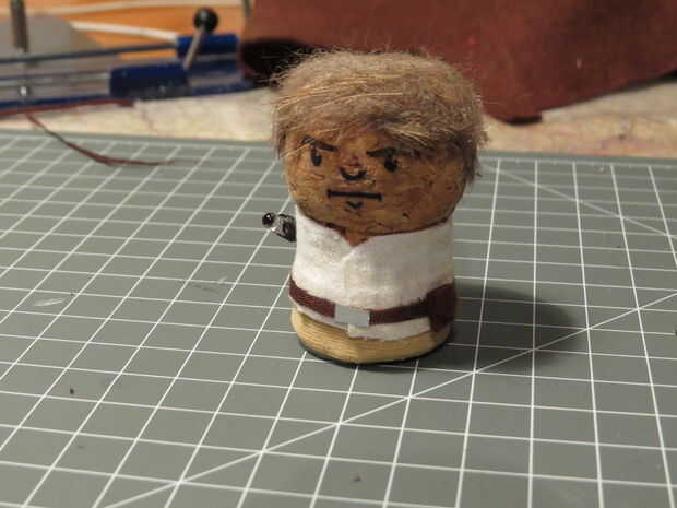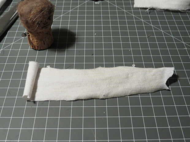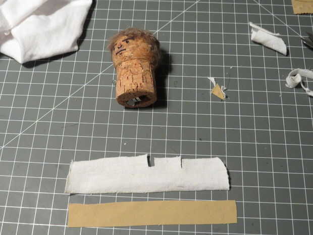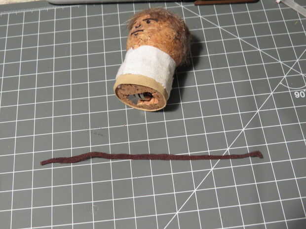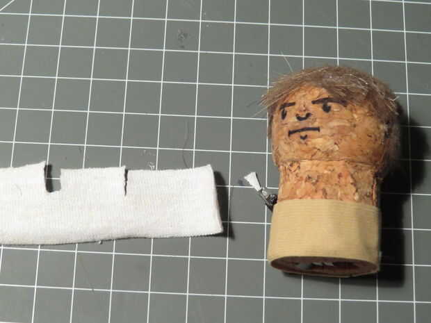Corte otra tira de tela marrón oscurezca, aproximadamente de 3mm de ancho y pegar alrededor de la tela blanca para que se vea como un cinturón. Si desea agregar algún detalle puede Agregar un pequeño rectángulo de papel de aluminio como la hebilla y un trozo doblado de fieltro como una bolsa.