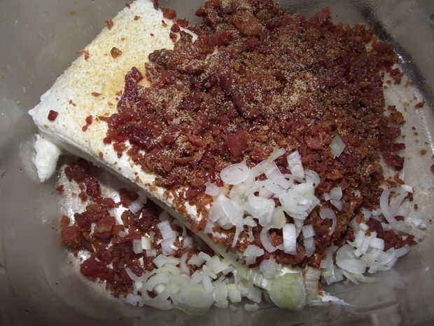 Agarrar un recipiente y permite empezar! La crema de queso necesitará ser ablandado sea más fácil mezclarlos. En el bol mezclar el queso crema, ajo en polvo, cebolla y tocino. Luego con un tenedor o su mezcla favorita de la herramienta mezcla todo junto muy bien.