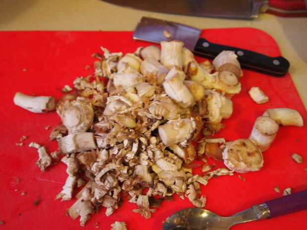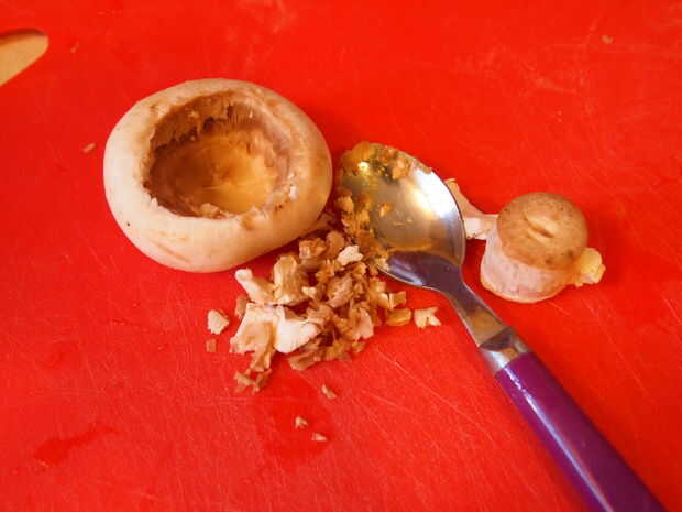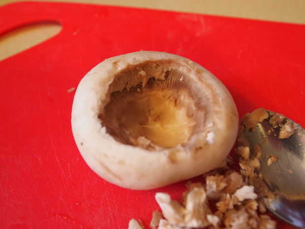 Primero, lave sus setas para quitar cualquier suciedad o impurezas. A continuación, tire de los tallos con cuidado para eliminarlos. Debe simplemente estallar justo hacia fuera. Si allí no es mucho de un bien o un espacio después de se retira, puede utilizar una cuchara para sacar algo de él hacia fuera para formar un espacio más grande donde usted más adelante pondremos el relleno. Cuando estás eliminando los tallos - guárdelos en una tabla de cortar o en un bol.