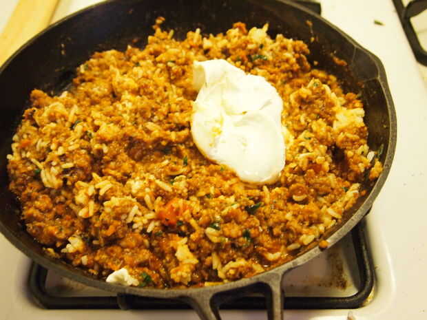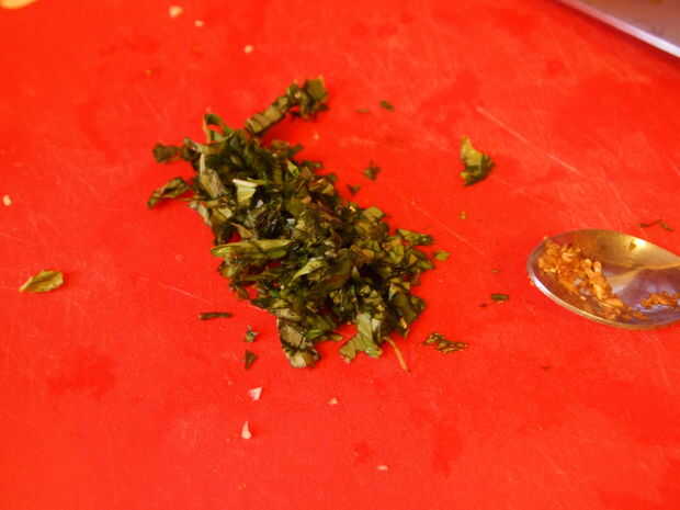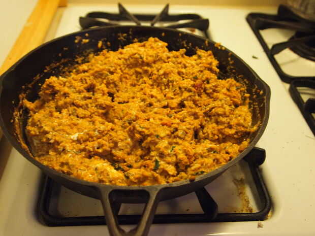 Ahora saca tu albahaca fresca y lavar y picar para arriba. En este punto la carne será un poco seca. Ahora debería ser tiempo de agregar 1 taza de salsa para pasta. Después de agregar la salsa de pasta debe agregue la albahaca y retirar la carne del fuego. Por último, mezclar en su 1 taza de arroz y 1 taza de queso crema y 1/2 taza de migas de pan. El queso se derretirá y se mezcla junto con el resto de los ingredientes, como mezclarlos para arriba.