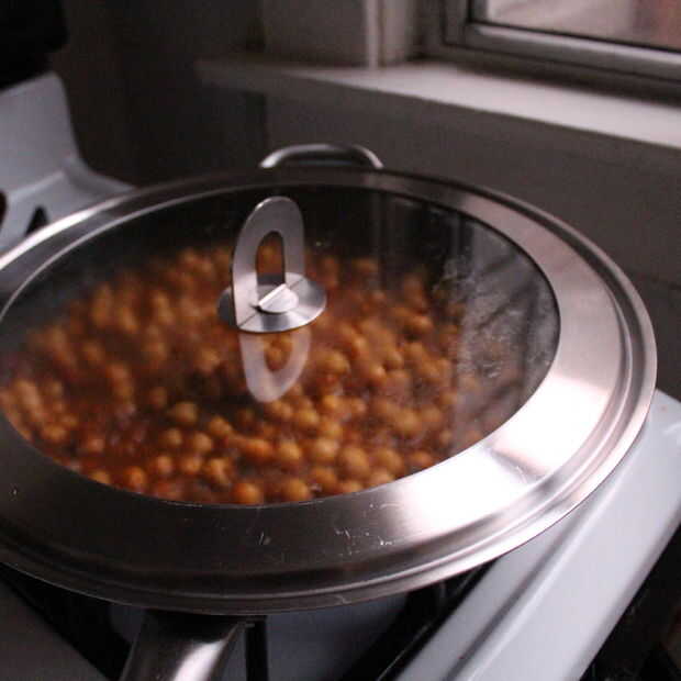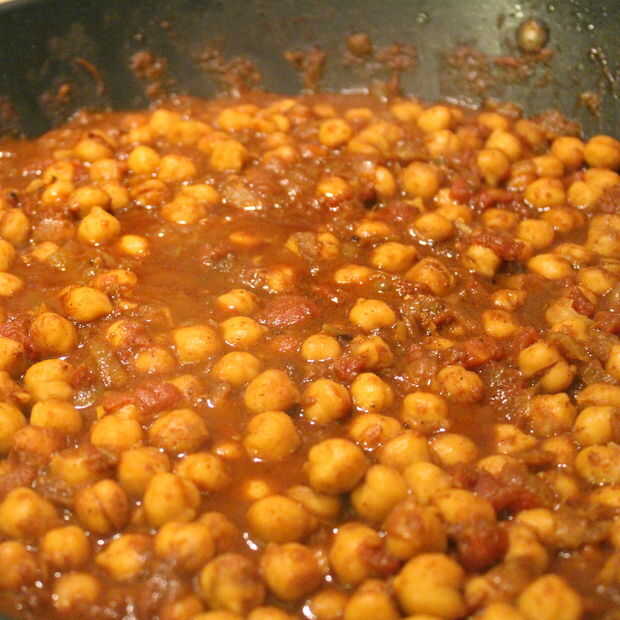 Cocer a fuego lento con la tapa en al menos 20 minutos. Cuanto más, mejor. Consigue todo con sabor a toman un poco los garbanzos. Si el líquido es bajo, agregue más de 1/4 de taza a la vez. Me gusta mi chana masala un poco menos picantes, así que dejé la mayoría de mi líquido evapórese.