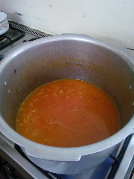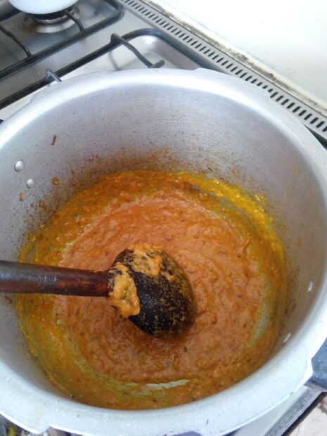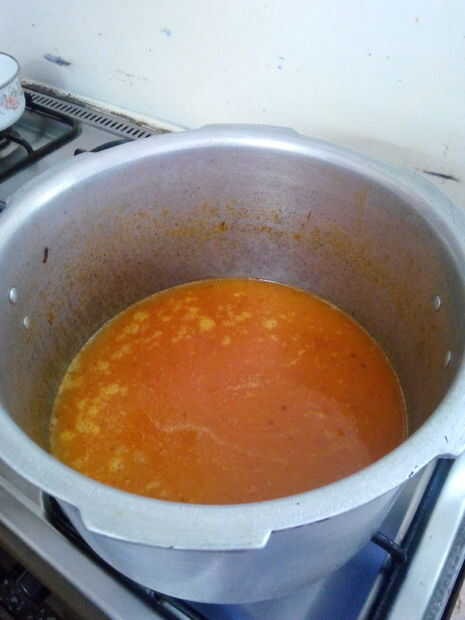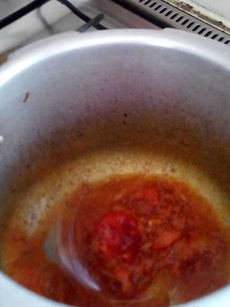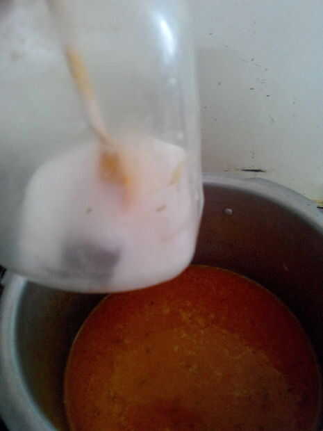 - Añadir la cebolla frita y puré de tomate (Nota: mina está congelada) y cocinar.