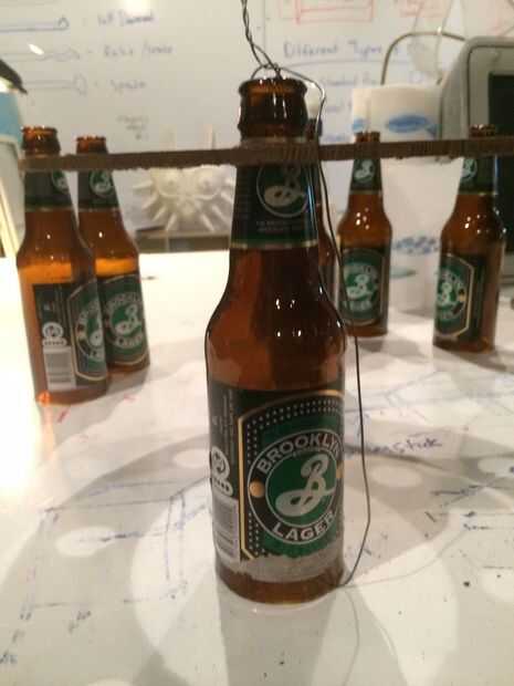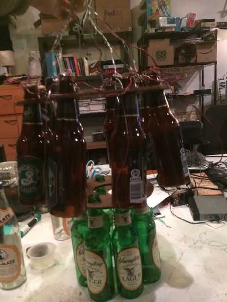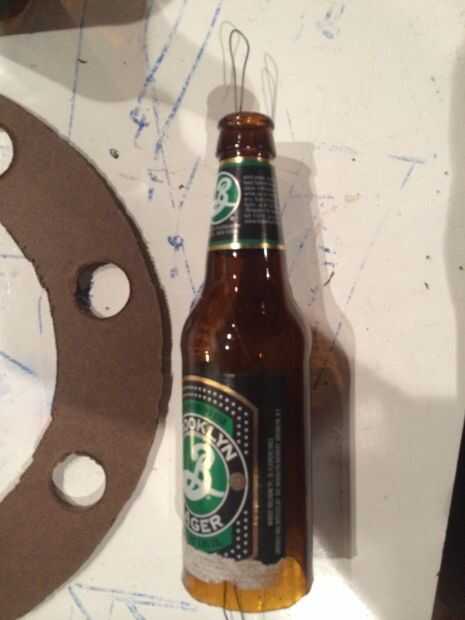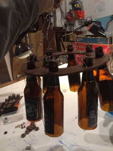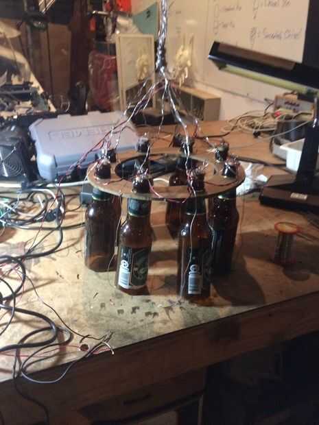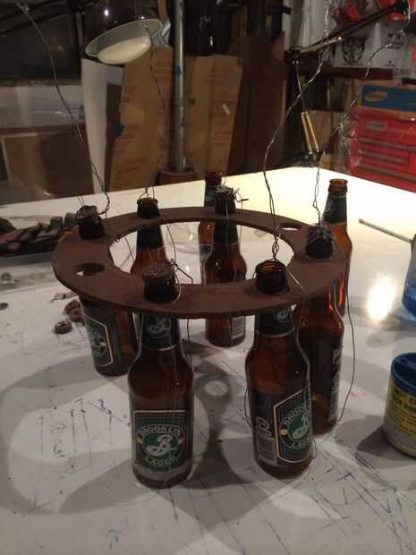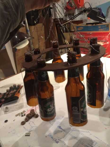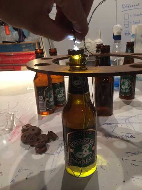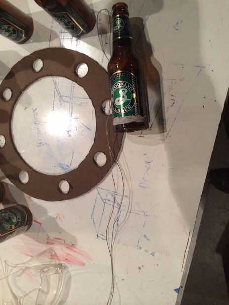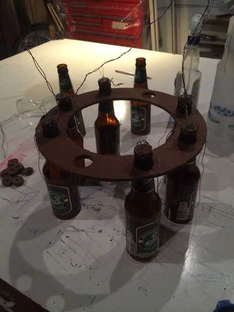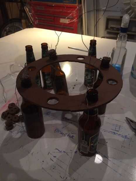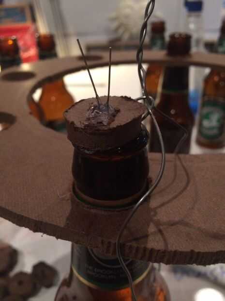 ¿Entiendo? Es agradable. Ahora tiempo para algunos LED. Usando esos handy dandy perfectamente botella cuello tamaño sierras de desechos con un agujero de 1/4" en el centro, tamaño perfecto para LEDs de 5mm más--vamos a pegamento caliente un LED en el orificio de cada donut MDF. Cuando esto se seca y luego se caliente pegamento cada led donut relleno en la parte superior de cada botella, llevó la cabeza hacia abajo (piernas pegándose para arriba). Tendrá que empujar el alambre del achique en el interior borde de la llanta del cuello de la botella, sino que debe trabajar de que forzarlo y utilice un grano de buen tamaño de pegamento caliente.