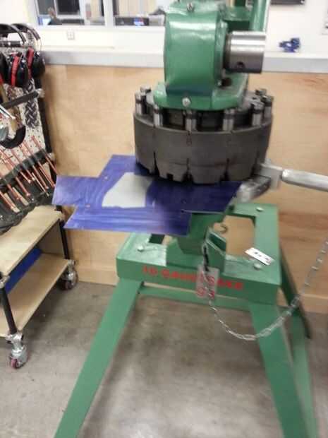 Donde las esquinas vienen juntos en el cuadro que estamos haciendo, necesitamos algunos relieves para que las esquinas no vendar. Utilizamos el punzonado de torreta para hacer unos agujeros de 1/4 de pulgada. Otra vez, muy fácil cuando hay un instructor excelente que muestra cómo utilizar las herramientas nunca ha visto antes.