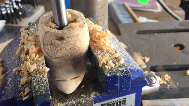 El último paso en la creación de la forma es hacer un agujero grande en el centro de la forma que se utilizarán para empezar a construir el centro de la rosa. La rosa se hace de adentro hacia afuera. Lo más fácil de hacer si usted tiene acceso debe utilizar una pieza Forstner para crear el vacío en el medio. Esto podría hacerse también por varios agujeros o cincelar el centro hacia fuera.