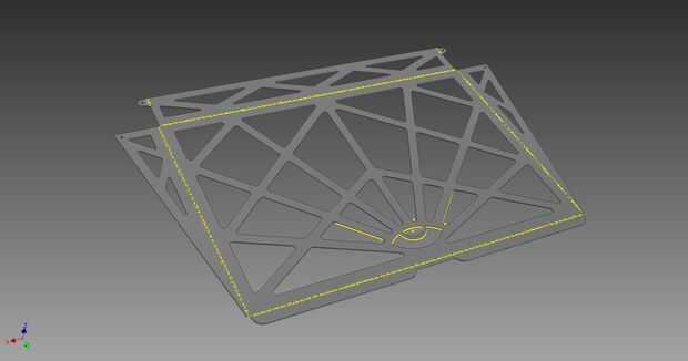Esta bandeja está construida para las dimensiones de un Dell enorme. Fui con un patrón inspirado del braguero de triángulos con un ojo todo lo ve "sutil" para vigilar a mi máquina. Medir en consecuencia su equipo preferido y el diseño. Regla general: cuanto más agujeros mejor, siempre y cuando no comprometa la estructura o las líneas de pliegue.