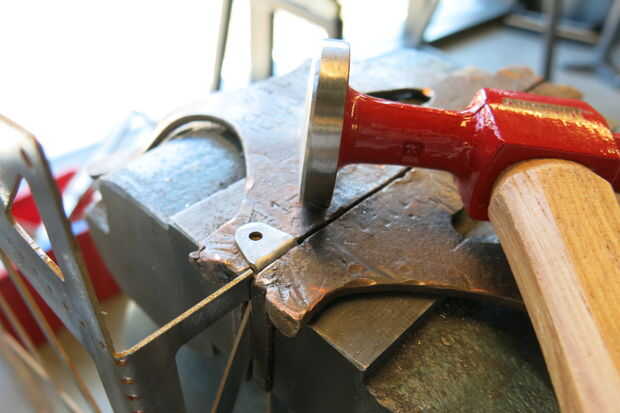 Para ello he utilizado un martillo de metal de hoja que tiene una cara plana especial en cuanto a no mare (hoyuelo) el acero. Un bloque de madera o martillo regular podría trabajar así. Repita en el lado opuesto.
