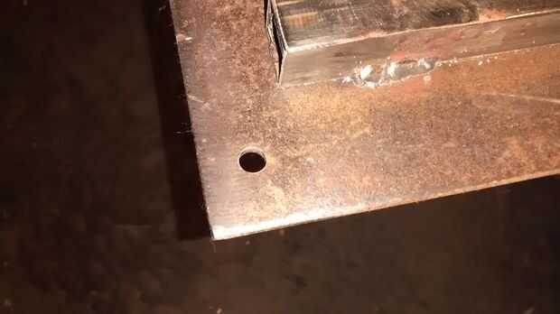 El paso de la perforación es fácil. Todo lo que necesitas son unos agujeros para sujetar el dado contra la pieza base. Un agujero en cada extremo de la terraja se alineará con un agujero en cada extremo de la placa base. Otra vez la ubicación exacta de los orificios no es que importante, lo clave es que el borde de la línea matriz hasta aproximadamente 1/8" detrás del borde de hierro ángulo. Para ajustar el espesor del material he hecho los agujeros en el ángulo de hierro más grande, por lo que hay cierto margen para jugar con la colocación. Para hacerlo correctamente, la mejor cosa a hacer es empotrar las piezas que desee y perforar ambas piezas al mismo tiempo.