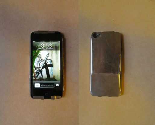 Hice un caso para mi iPod 5 de hoja aluminio, pegamento caliente y cinta adhesiva. Usé una sierra para metales, Sierra de marquetería, amoladora, taladro y archivos en lo que es.