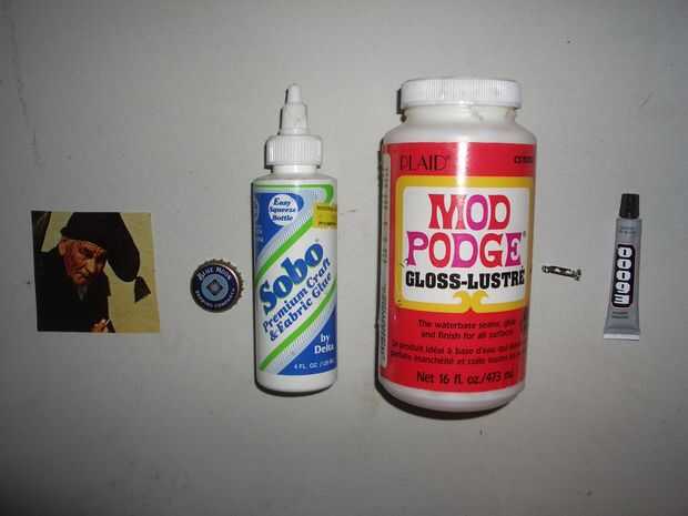 Necesita una imagen o texto, si eso es más su taza de té, una chapas, pegamento blanco, algunos Mod Podge, un pincel, un pinback y algunos pegamento hardcore - consiguen algo hecho para la celebración de metal.