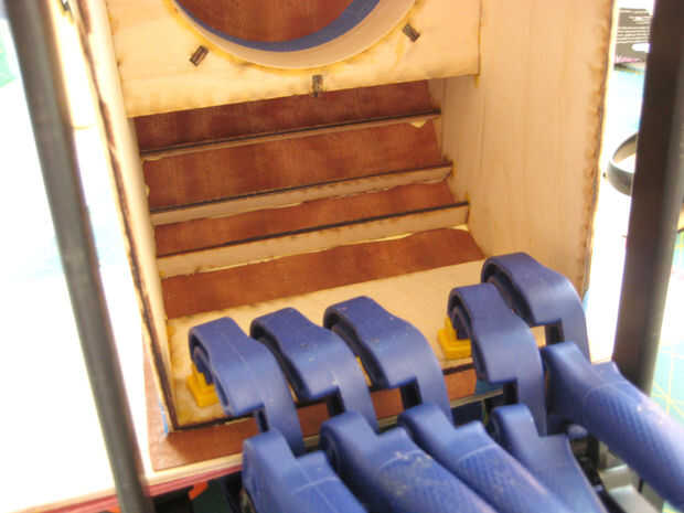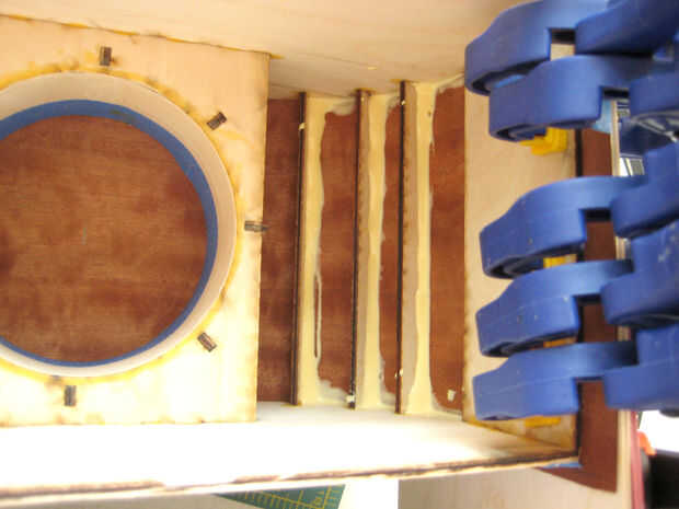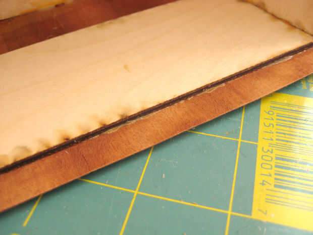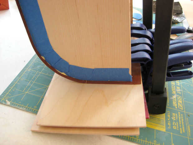 Pegamento por los bordes y el panel lateral, envuelva la chapa cuidadosamente alrededor de la curva y el extremo de la abrazadera. Deje que se seque.