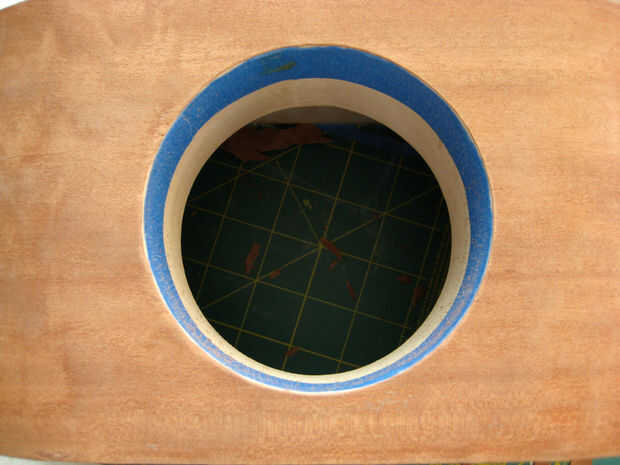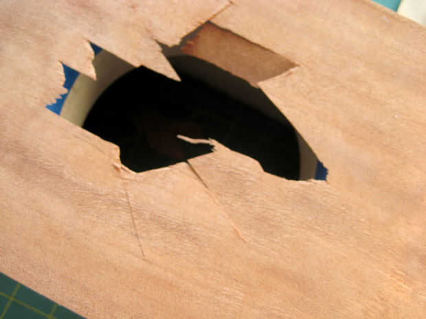 Cortar la ventana del centro. Hice algunos cortes a través de con mi cuchillo y pedazos astillados hacia fuera. Yo llamo a esto el enfoque de "Kool-Aid Man". Tenga cuidado de no el chip de la madera de la cara. Mantenga su área de trabajo despejada así que si usted algo de la viruta tiene una mejor oportunidad de encontrar el chip de modo que usted puede pegar en el lugar.