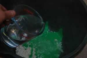 Usted tendrá que experimentar con la cantidad depende del palo y cuánto chapotea quieres producir, pero un buen punto de partida es utilizar ½ a ¾ litros de agua por el palo. Es posible recargar con más agua a medida que mezcla, pero obviamente casi imposible quitarlo.