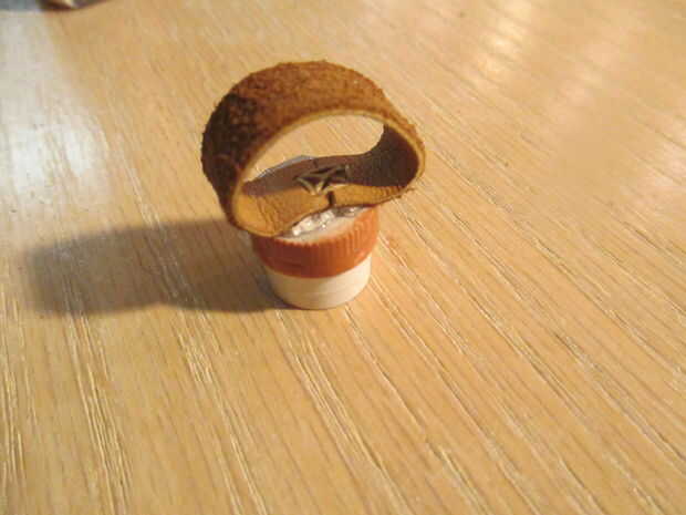 2. Aplique un adhesivo fuerte en la parte de gamuza de la banda de cuero Dónde está el nudo y en la parte inferior del contenedor recién hecho. Dejar secar el tiempo recomendado. Realmente.