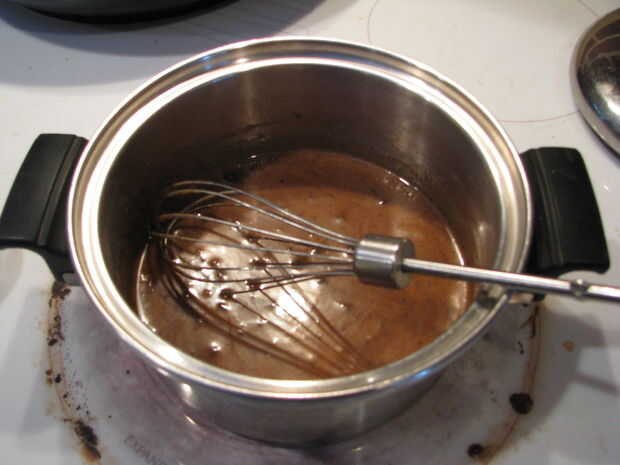 Coloque 1/4 c. crema de leche en una cacerola pequeña. Añadir 1/2 T. espresso en polvo, jarabe de maíz de 1 T., azúcar granulado 1/2C. Revuelva sobre fuego medio hasta que el azúcar se disuelva y la mezcla empiece a hervir.