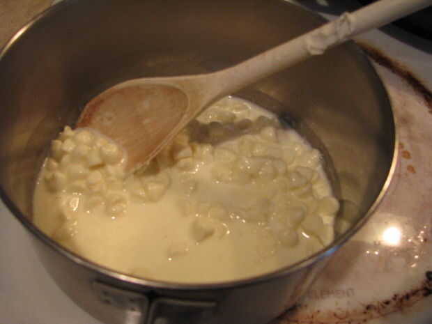 Coloque la mezcla de azúcar a un lado para enfriar durante unos 10 minutos. Mientras tanto, colocar crema de c. 1/4 en una cacerola pequeña. Calentar hasta que la crema comienza a vapor. Con esta pequeña cantidad es muy rápido. Luego agregar chips de chocolate blanco 1 taza y dejar reposar durante un par de minutos.