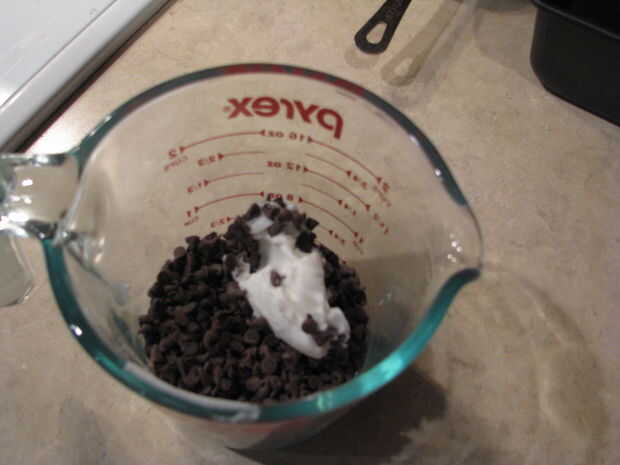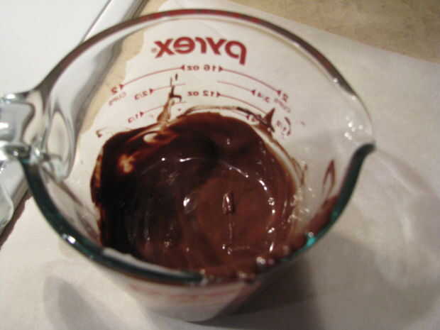 Una vez que el caramelo se prepara la cobertura de chocolate.  Añadir el chocolate semiamargo 1 c. a un recipiente de vidrio profundo (como un vaso de medición de 2 tazas).  Añadir grasa vegetal T. 1.  En incrementos de 30 segundo en el microondas el chocolate, sacarlo y removiendo entre explosiones.