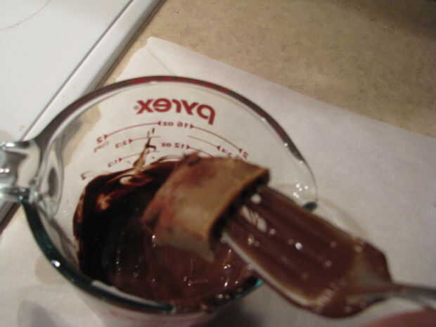 Retire el caramelo del molde. Cortar el caramelo en cerca de 20 plazas. Aquí usted puede dejar el caramelo como plazas, o tomar un cuadrado y rodar en una bola. Tome el pedazo de caramelo y lanza en un tenedor. Mojar el tenedor en el chocolate, cubriendo todos los lados lo mejor que podáis. Sacudir cualquier chocolate extra. Coloque el chocolate en un pedazo de papel encerado. Espolvorear con jimmies chocolate (chispitas) y dejar secar.