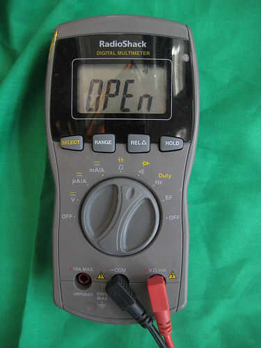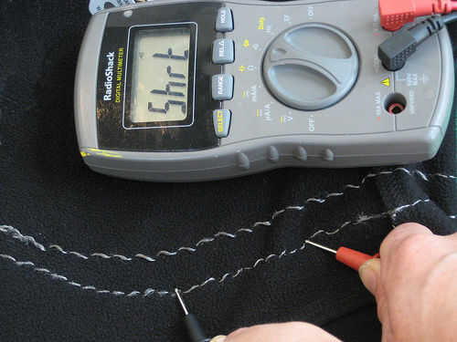 Pone una pila AAA en la alimentación y mueva el interruptor de alimentación a la posición de encendido. Debe encender la luz roja en la fuente de alimentación. Si no es así y estás seguro que movido de un tirón el interruptor, quitar rápidamente la batería y la comprobación de un cortocircuito entre el + y -. (Seguramente hay un trozo de hilo que está tocando tanto el - y + costura en alguna parte.) Puedes probar un cortocircuito entre + y - utilizando el probador de continuidad pitido de su multímetro. Ver este tutorial para obtener información sobre cómo utilizar el comprobador de continuidad.