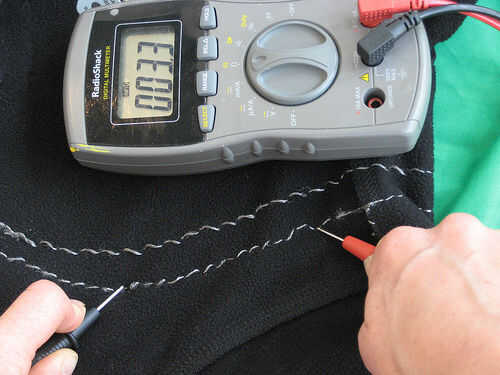 Por lo tanto, su chaqueta ahora está lleno de puntos conductores sin aislamiento. Esto está bien cuando un cuerpo está en su interior. Un cuerpo evitará que rastros cosidos se toquen. Pero cuando la chaqueta es de una persona y de la curva o doblar, rastros va a tocar uno al otro y fuera corto. Para solucionar este problema, cubre tus huellas con pintura tela hinchada (u otro aislante como una puntada de hilo regular). Pero, no desea cubrir rastros hasta que estés seguro de que todo funciona! Por lo tanto, utilizar el buen juicio en cuando a los rastros de la capa.