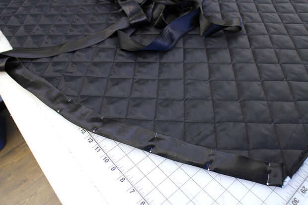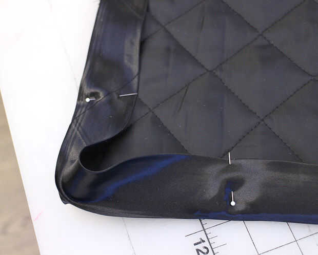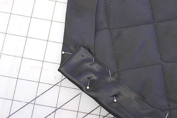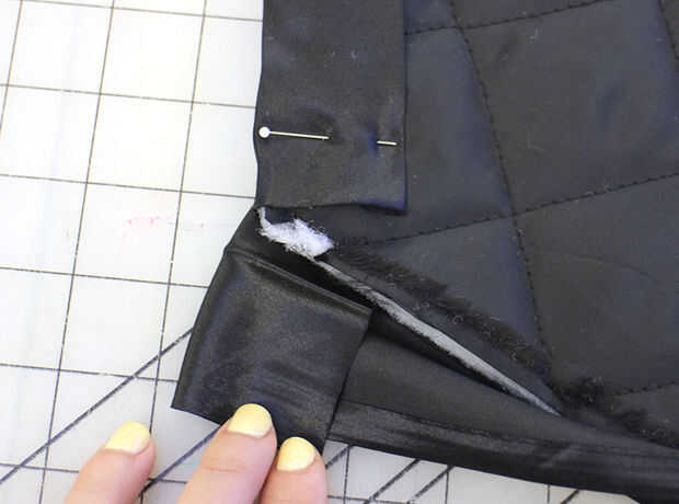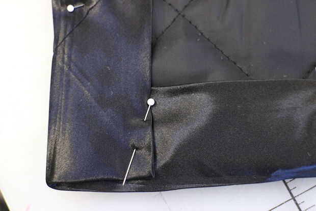 Mientras que han depositado llegar a una esquina, una vez que vas a hacer, el enlace en la esquina de la curva, pellizcar de la aleta del triángulo que saltara y plegar a un lado. PIN en el mismo lugar. Cuando han conseguido todo el camino alrededor del cuerpo y llegar a cumplir con el punto de partida, cortar el enlace de modo que sobresalga aproximadamente 1" de pasado, doblar el borde cortado hacia adentro y luego doble enlace para ocultar el borde interior.