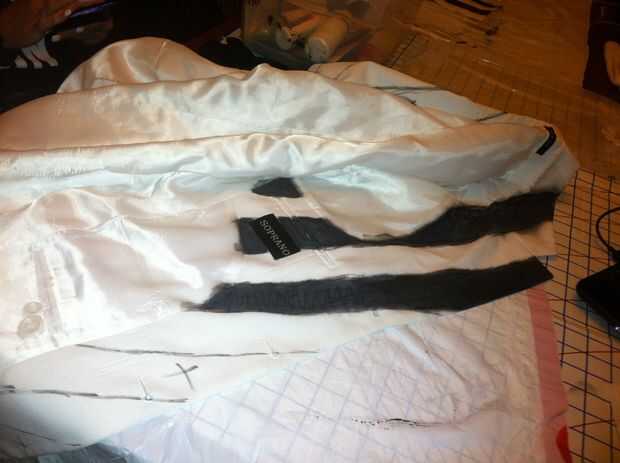 1. usando un marcador negro, mi mano dibujó las rayas en los negros con una "X" de la marca así que sabía que los a pintar. He utilizado una foto de la chaqueta original de BeetleJuice, muestro a continuación como referencia.