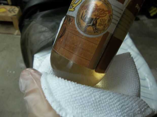 cargar su algodón y comienzo en como usted sería una camisa de hierro, asegúrese de mantenerlo incluso y llegar a las esquinas y en las costuras, ser generoso con él y no tenga miedo de volver y volver a hacer una sección, se oscurecerá algo pero aligerará un poco cuando se seque