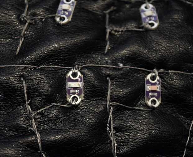Un buen lugar para empezar a coser es con las filas. Para hacerlos lo mas recto posible podría dibujar líneas débiles a coser a lo largo usando una regla. Una vez que han cosido estos, pasar a las columnas. Mucho cuidado deberá tomarse cada vez que una fila se llega porque es esencial que los dos no cruzan. Esto puede lograrse mediante la creación de la puntada para la columna en el interior de la chaqueta de este cruce, como se ve en la foto de arriba. Cuando haya completado todas las filas y columnas podría utilizarse un multímetro para comprobar que no haya cortocircuitos.