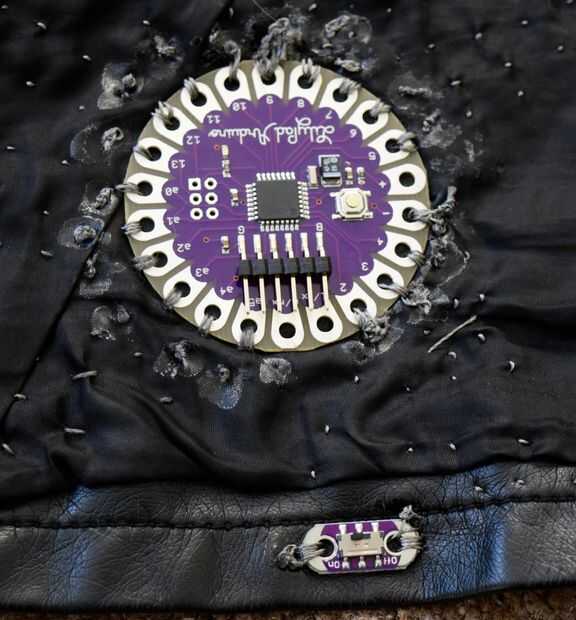 A continuación, puede Agregar un interruptor que se utilizará para cambiar la configuración de la chaqueta. Debe ser cosido en el interior de la chaqueta por debajo de la placa LilyPad Arduino. Con el hilo conductor, el extremo marcado con "off" debe conectarse a tierra y el extremo marcado con "on" debe conectarse al pin 2.