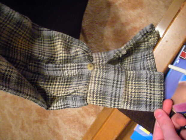 En primer lugar, utilice al abreojales para quitar los puños actuales y luego cortar el lado con el agujero del botón y la curva leve en el otro lado. Usted también tendrá que sacar los botones (ver imagen 1)