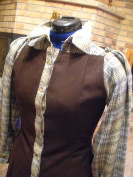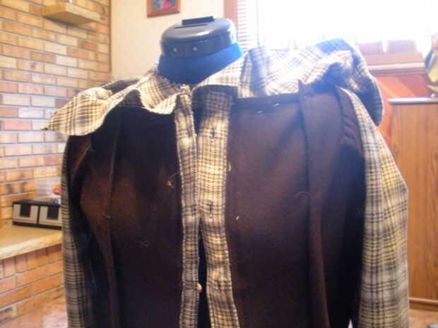 Primero puse la camisa de hombre debajo de la chaqueta para ver cuanto tengo que cortar para cubrir el área del cuello y los hombros. Usando un marcador hizo una línea de tres pulgadas de largo más abajo y necesarios en la camisa de hombre para marcar donde yo debo cortar antes de picarlas. (cuadro 1)